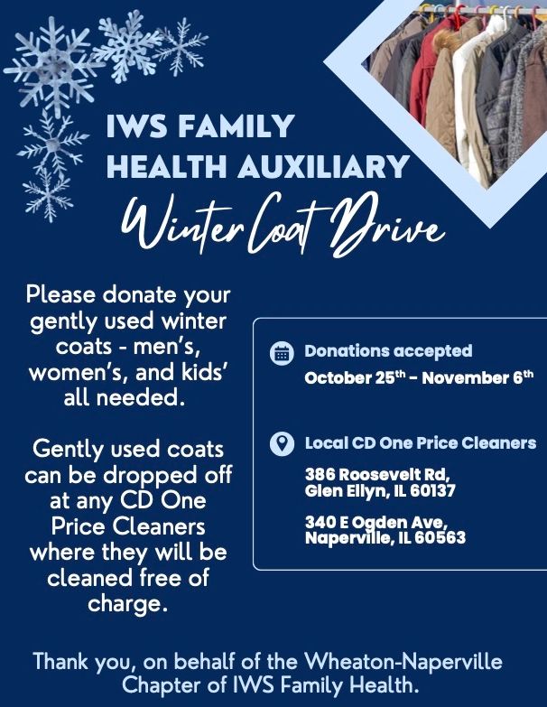 We will also be collecting donations of new coats, hats, mitten, gloves, scarves, and snow pants. Friends of Wheaton-Naperville Infant Welfare may contact a WNIW member for a drop-off location by November 4th or email us at secretary@wheatoninfantwelfare.org to arrange for a local pickup or drop-off.